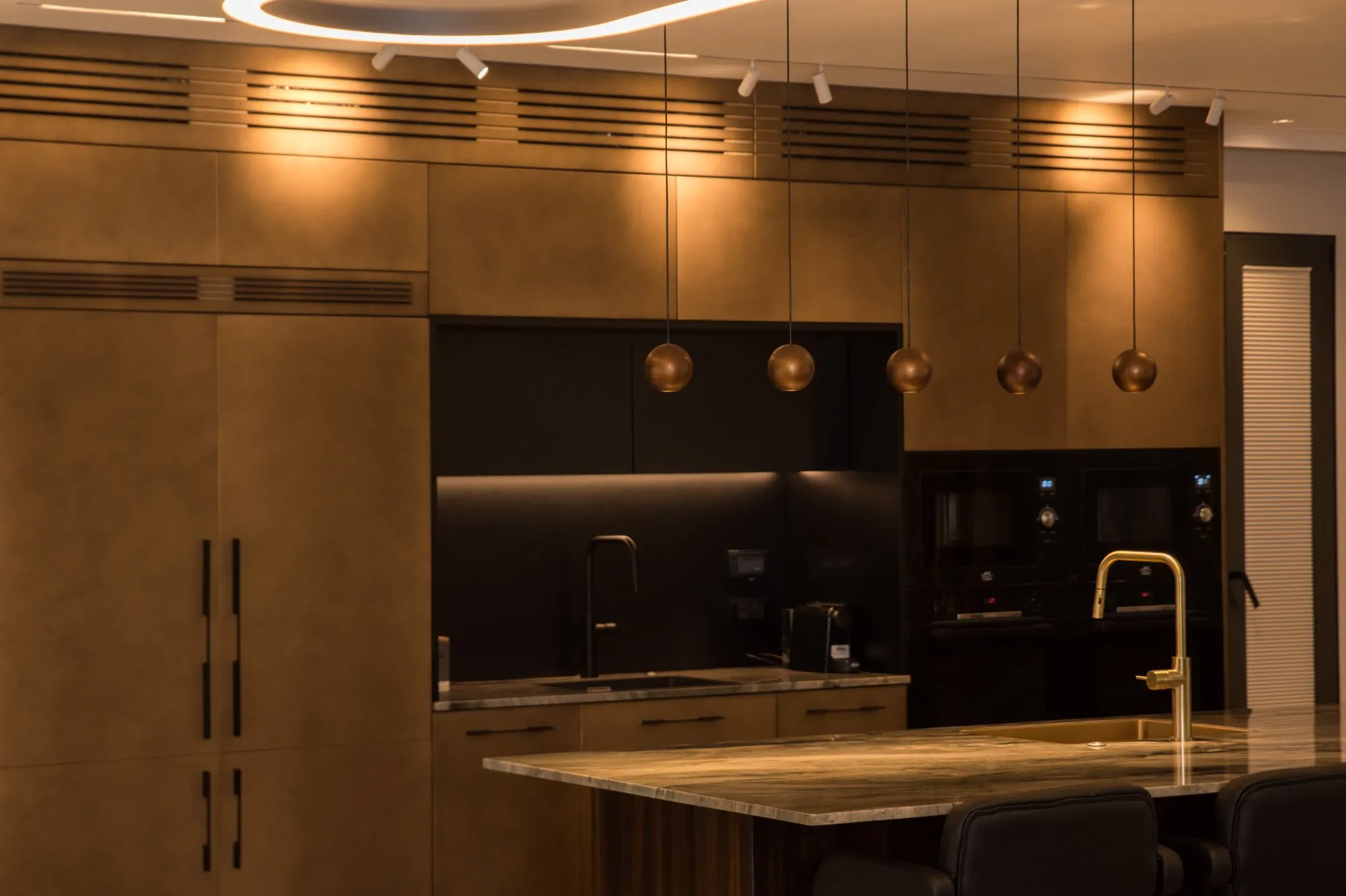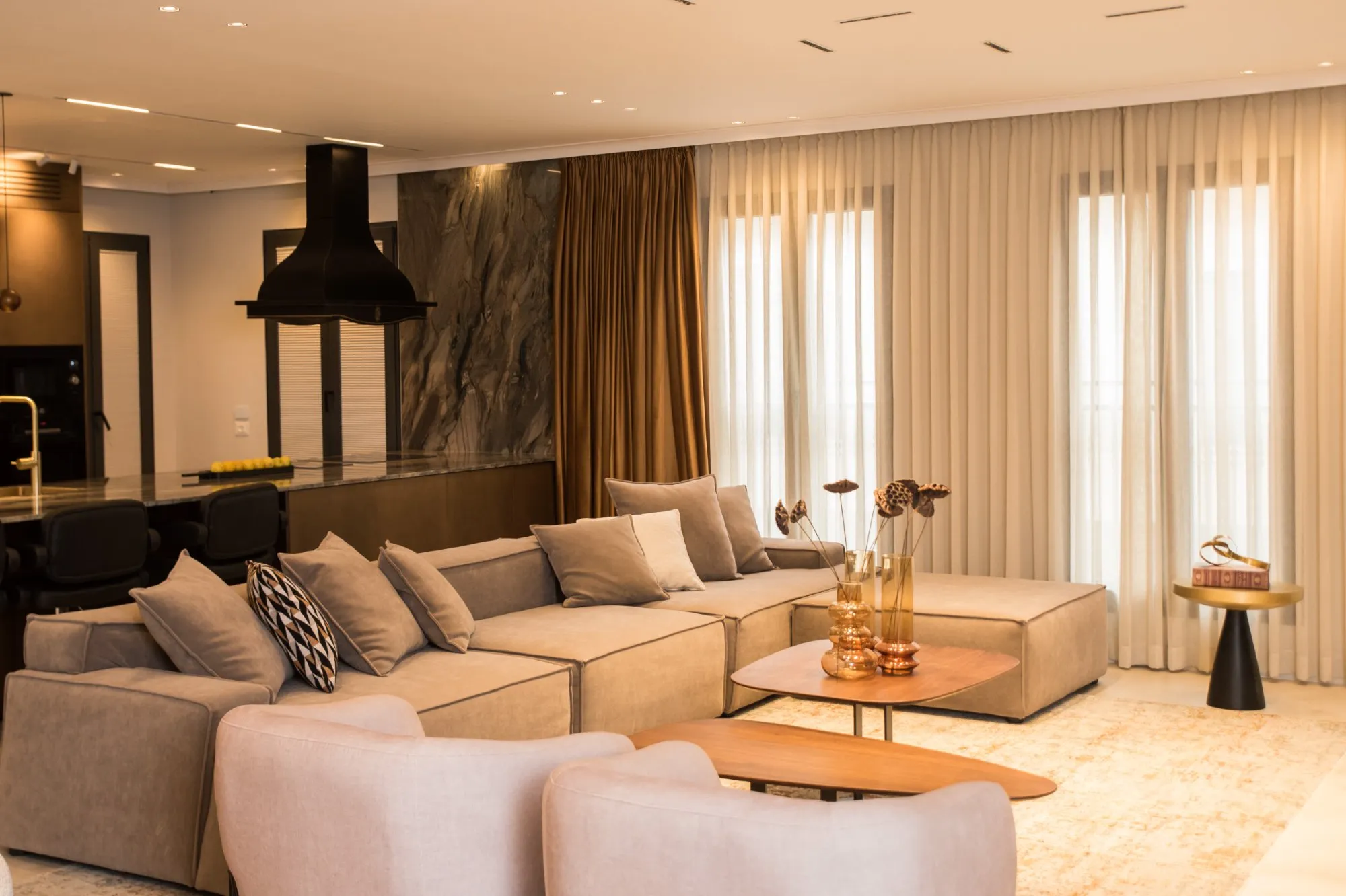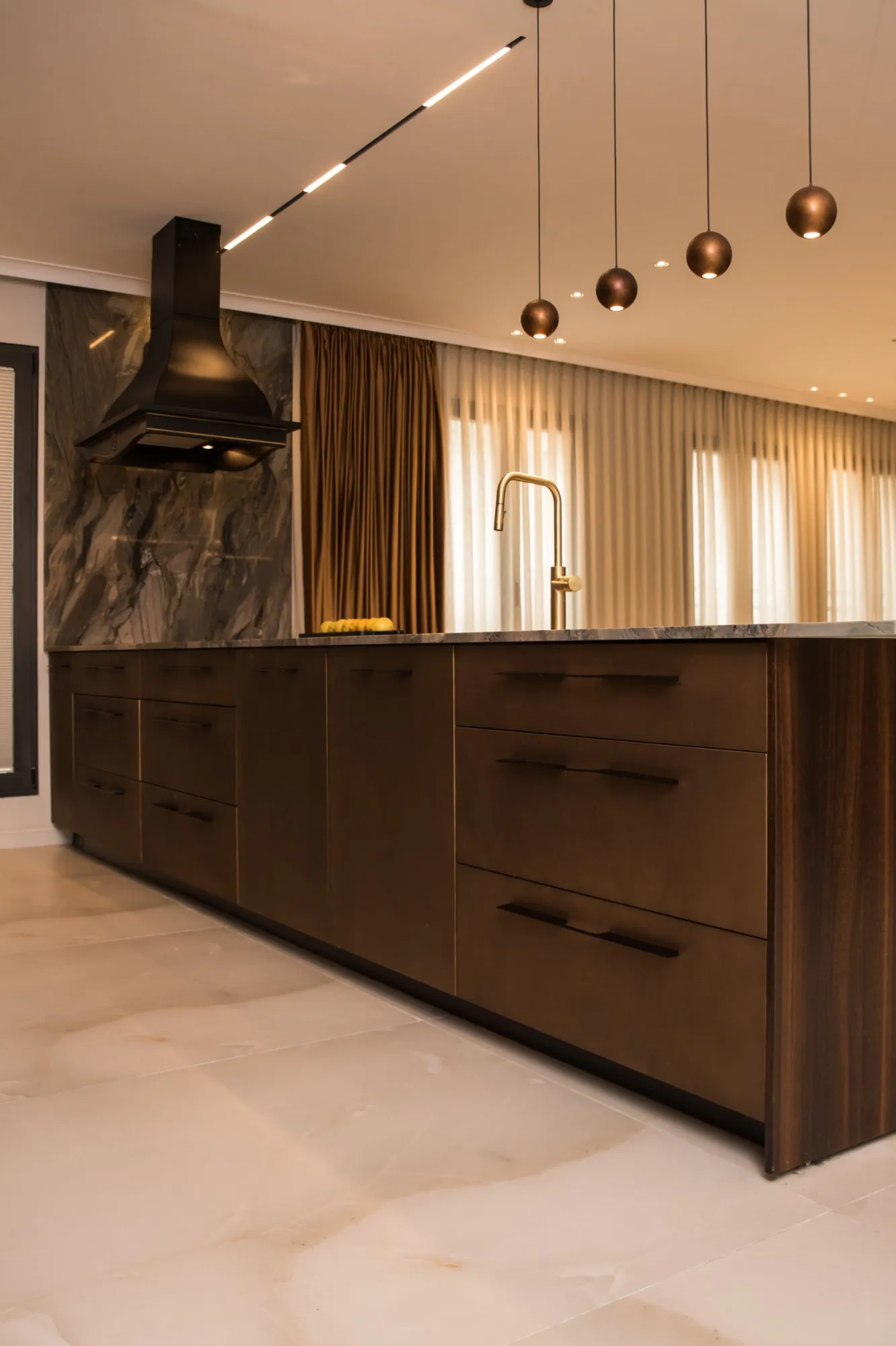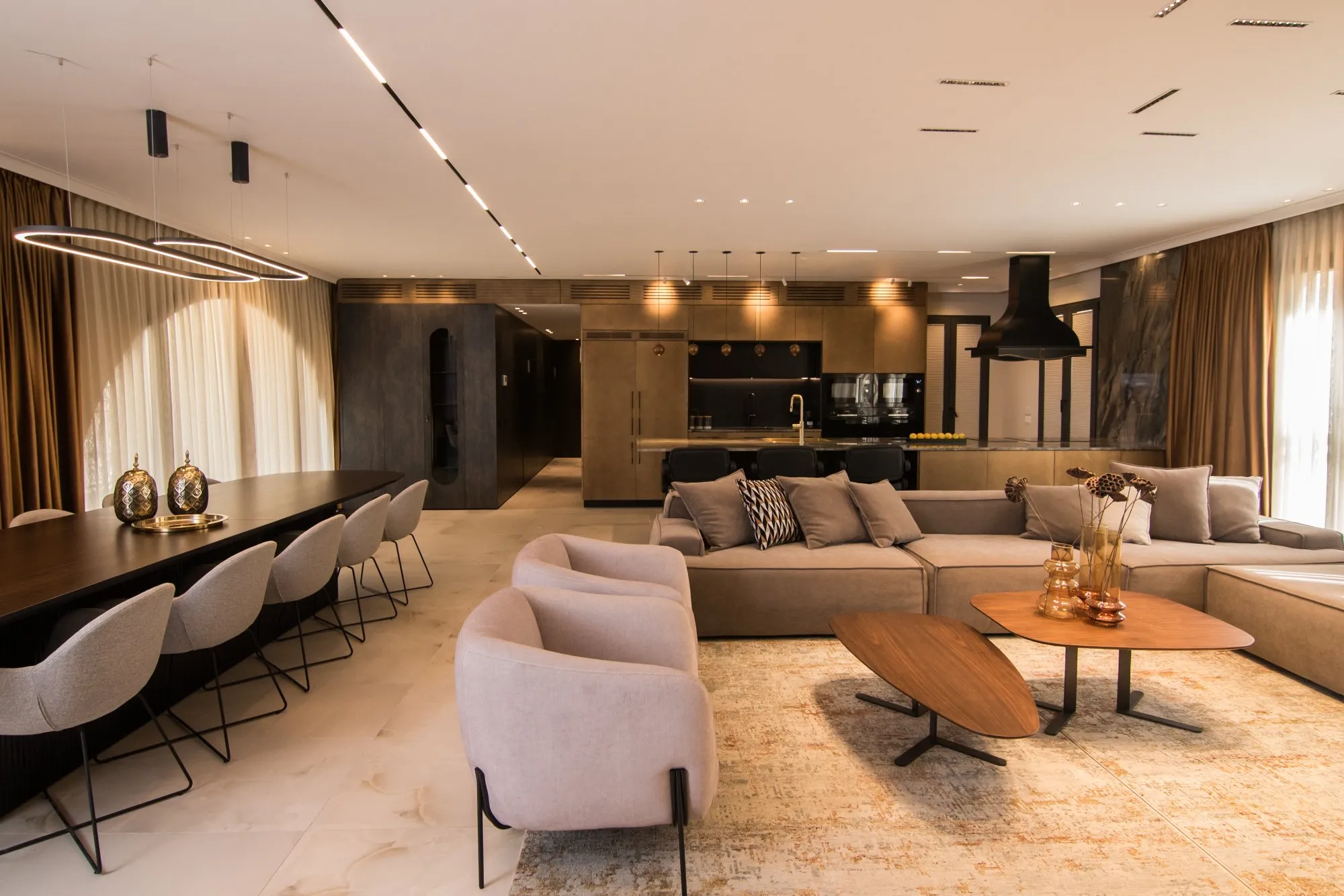 הדירה תוכננה עם חלל אירוח מרווח מאוד, מטבח עם משטח אבן טבעית שנבחרה בקפידה בהתאמה מושלמת עם צבע הנחושת של ארונות המטבח, ספרייה עם טלוויזיה נסתרת ופינת נטילת ידיים מעוצבת נגישה לאורחים.