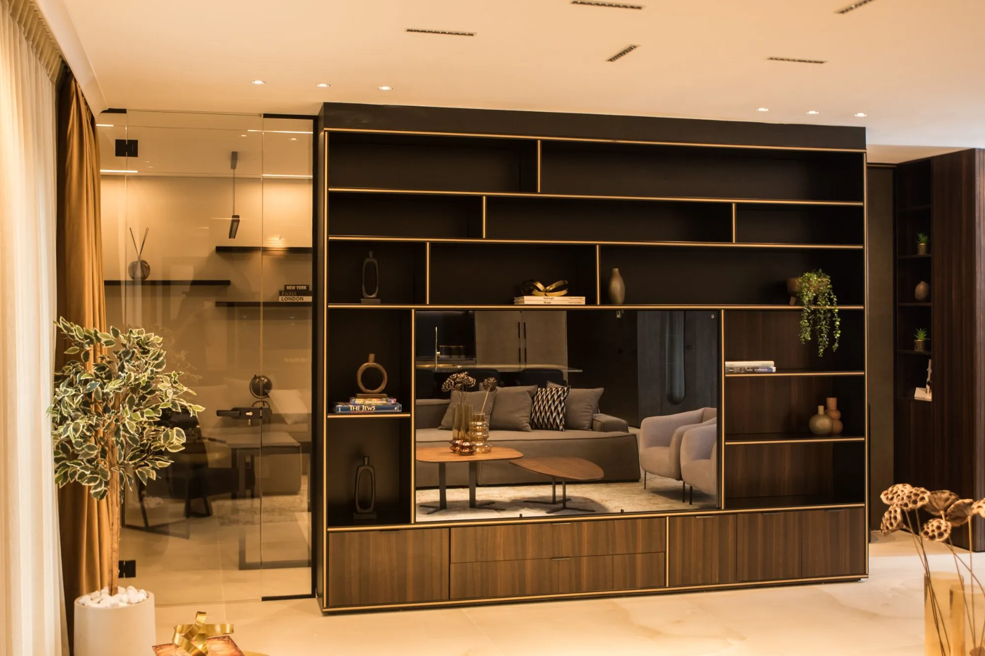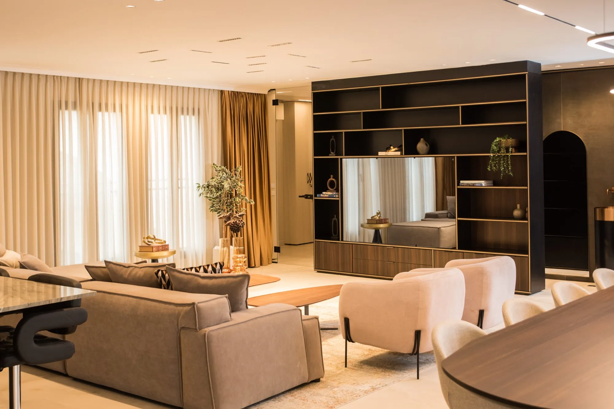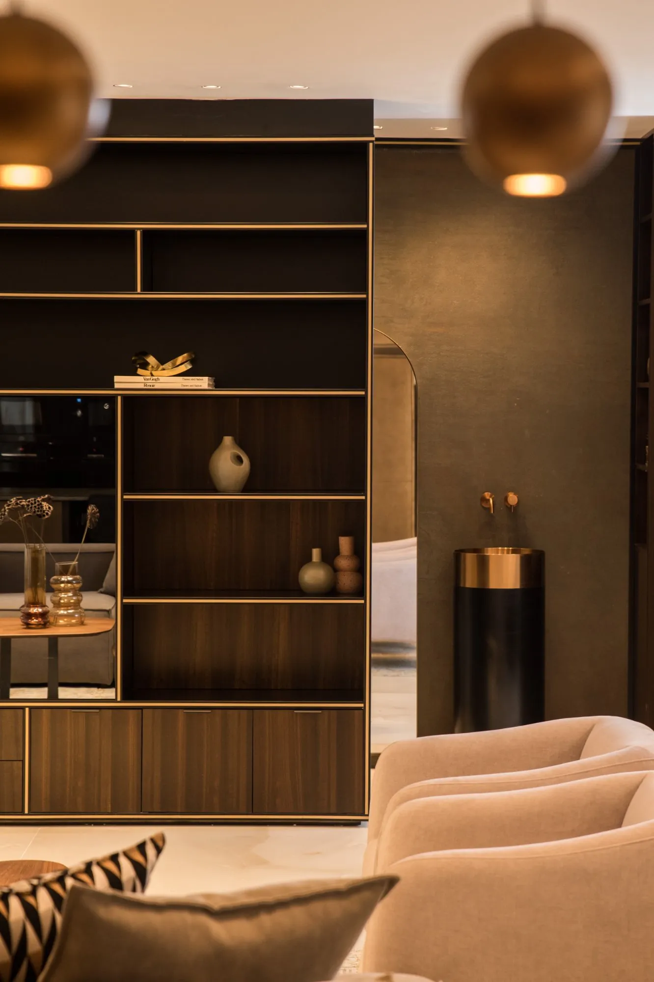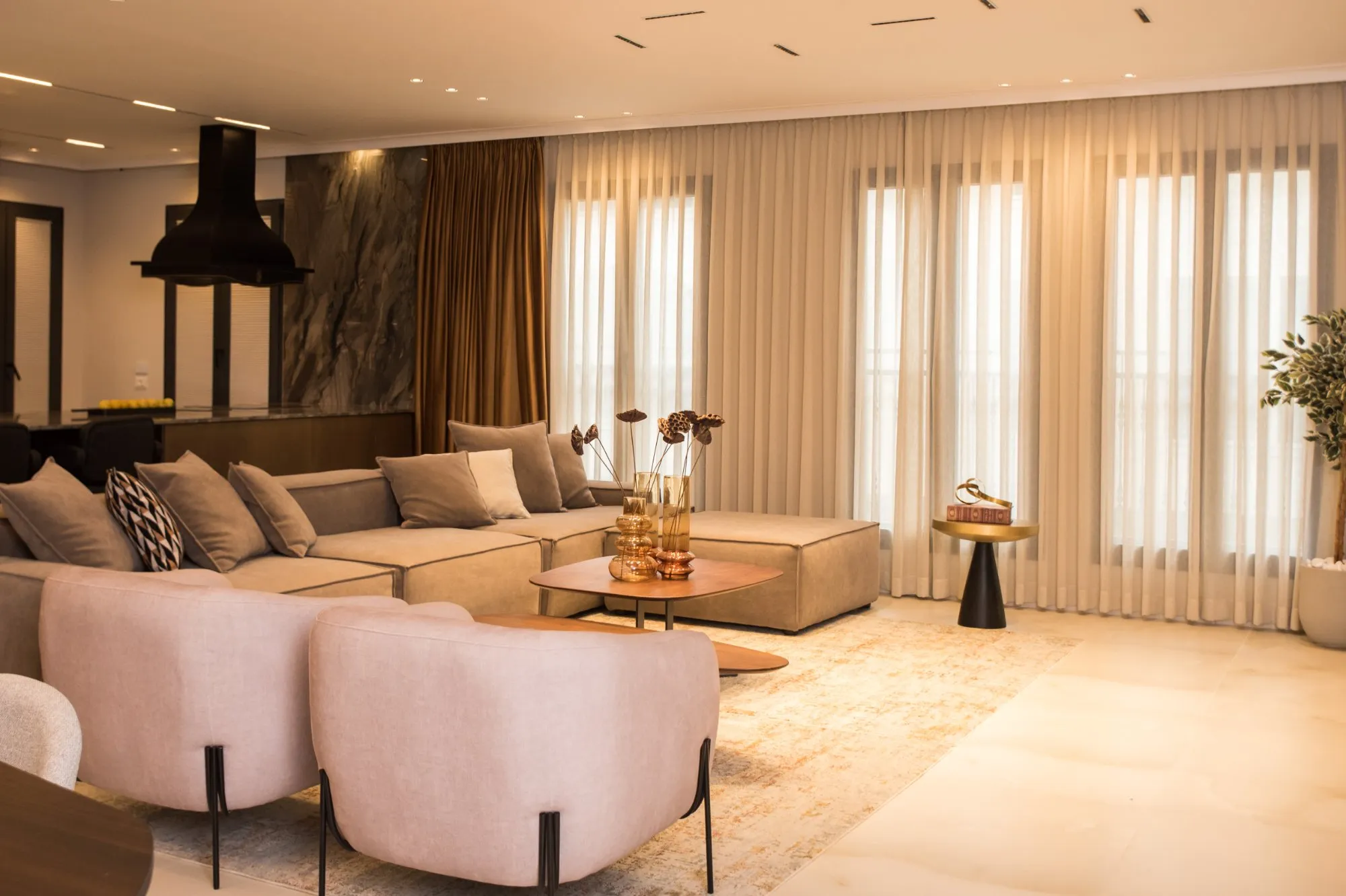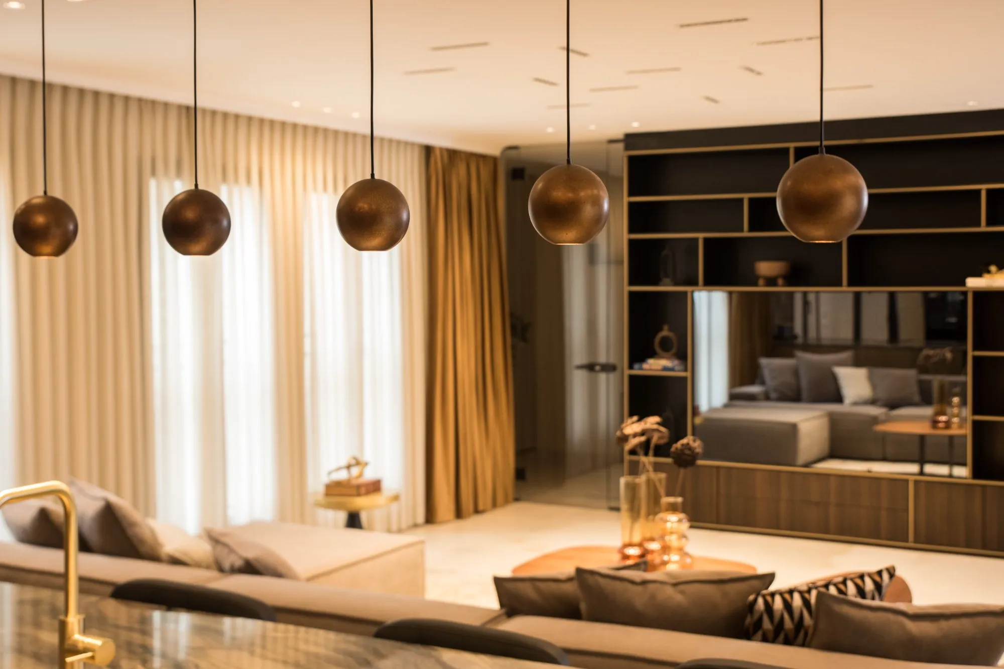 הדירה תוכננה עם חלל אירוח מרווח מאוד, מטבח עם משטח אבן טבעית שנבחרה בקפידה בהתאמה מושלמת עם צבע הנחושת של ארונות המטבח, ספרייה עם טלוויזיה נסתרת ופינת נטילת ידיים מעוצבת נגישה לאורחים.