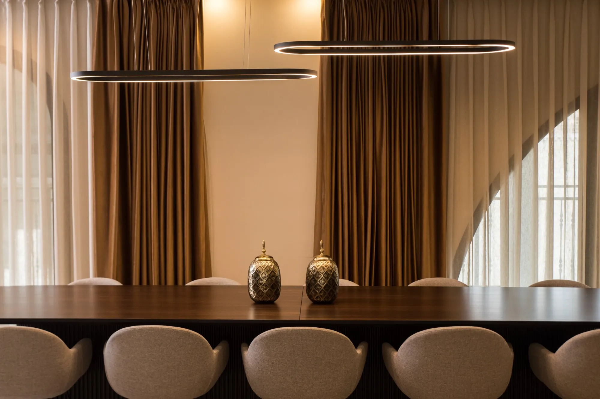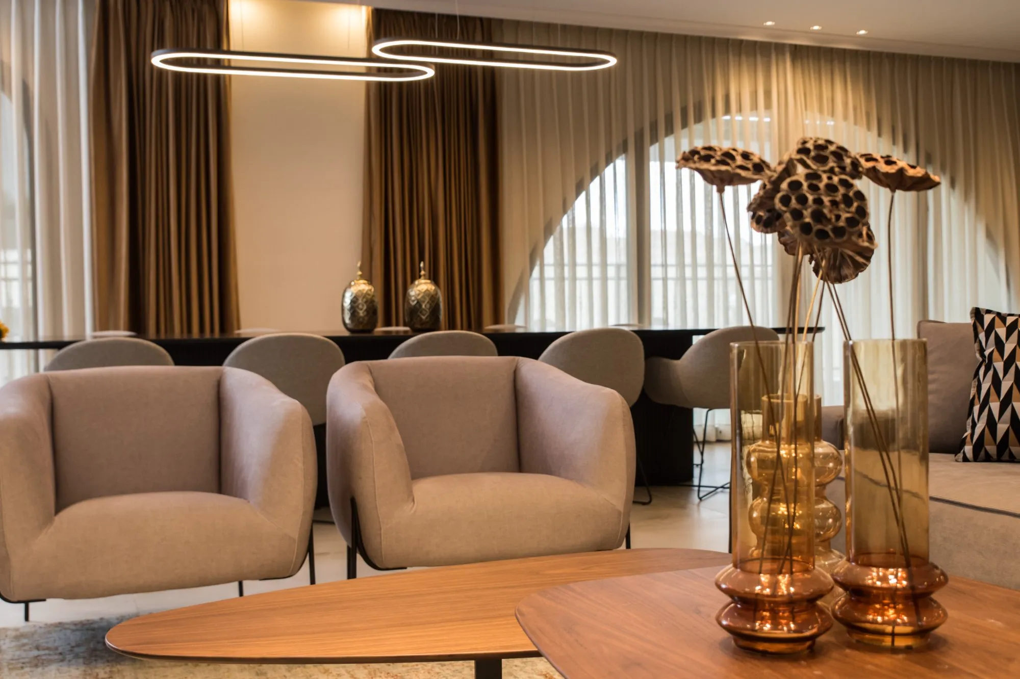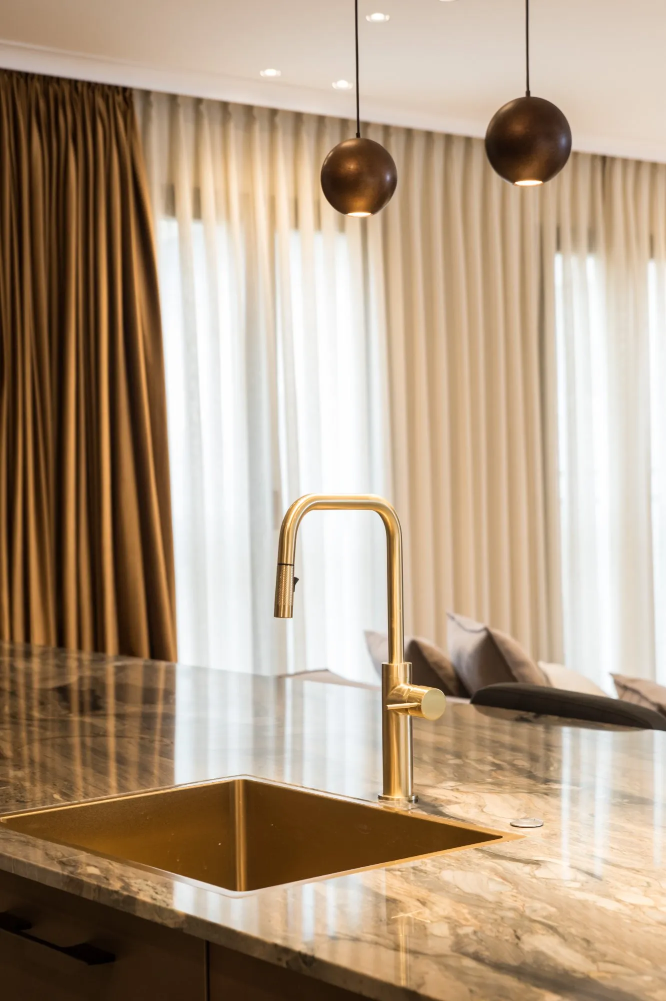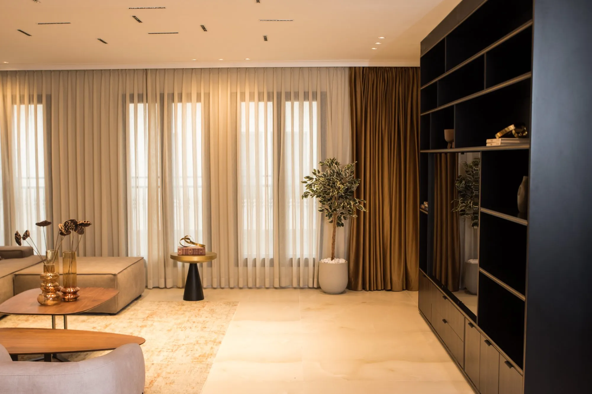 הדירה תוכננה עם חלל אירוח מרווח מאוד, מטבח עם משטח אבן טבעית שנבחרה בקפידה בהתאמה מושלמת עם צבע הנחושת של ארונות המטבח, ספרייה עם טלוויזיה נסתרת ופינת נטילת ידיים מעוצבת נגישה לאורחים.