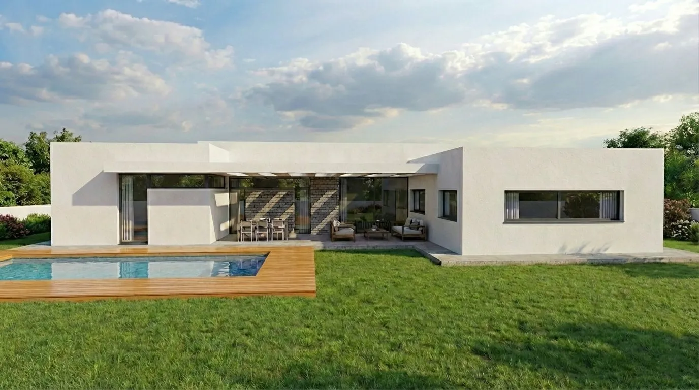 אזור המגורים נפתח אל החצר האחורית והבריכה, הממוקמת בחלקו האחורי של המגרש ומייצרת מרחב חוץ אינטימי ונעים. החזיתות האחרות תוכננו באופן המאפשר פרטיות תוך שמירה על כניסת אור טבעי לחללי הבית.