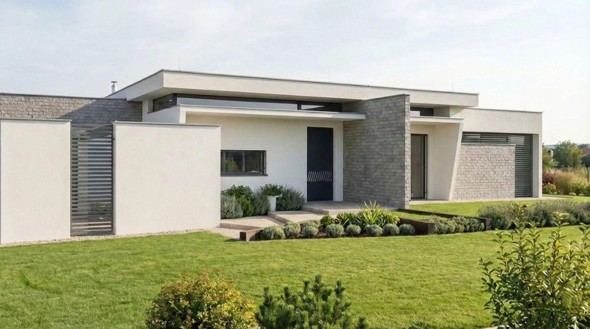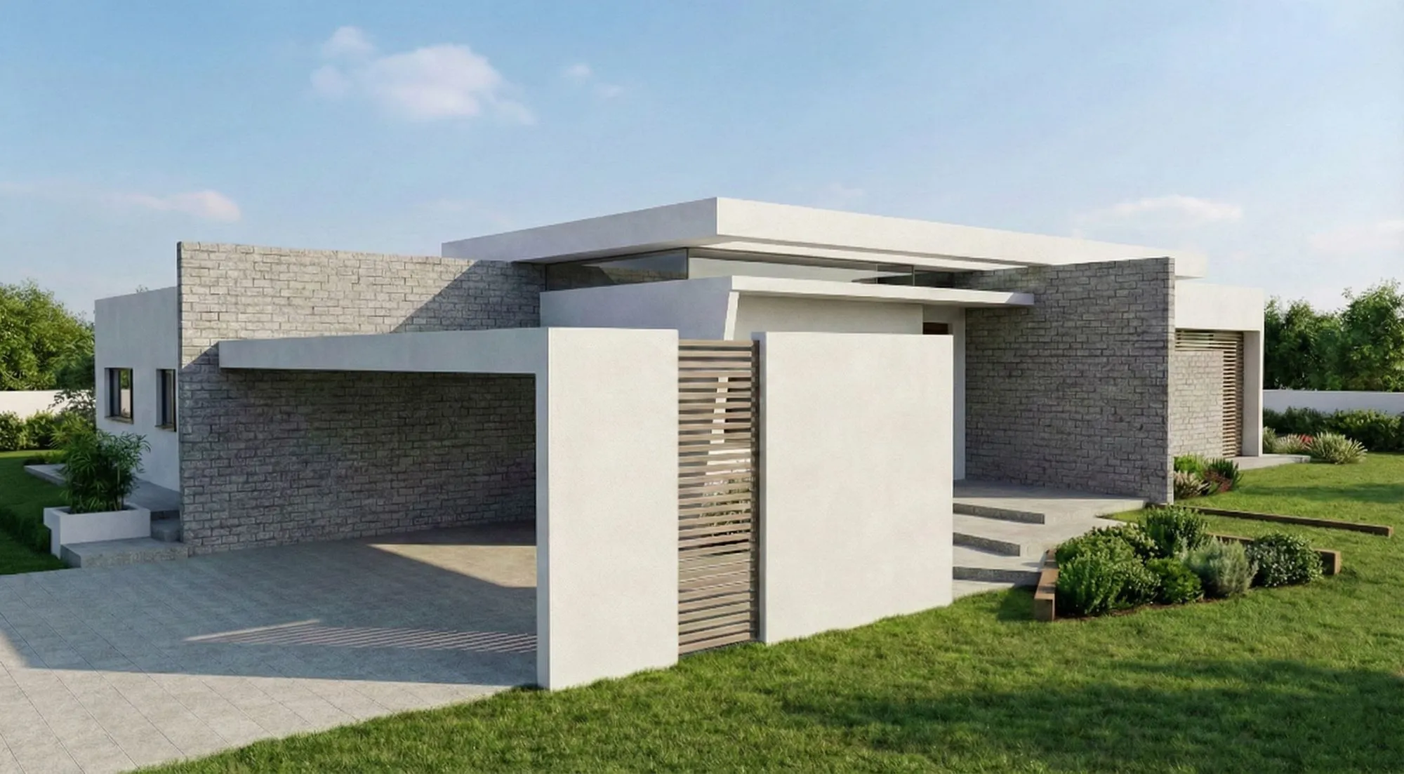 השפה האדריכלית מודרנית ונקייה, ומשלבת רפפות פלדה בפרגולות בכניסה ובחניה. אלמנטים של בריקים בגוון אפור מדגישים חלקים במעטפת המבנה, ואילו הכניסה לבית מודגשת באמצעות מדרגות בעלות גיאומטריה ייחודית היוצרות חוויית כניסה לא שגרתית.
