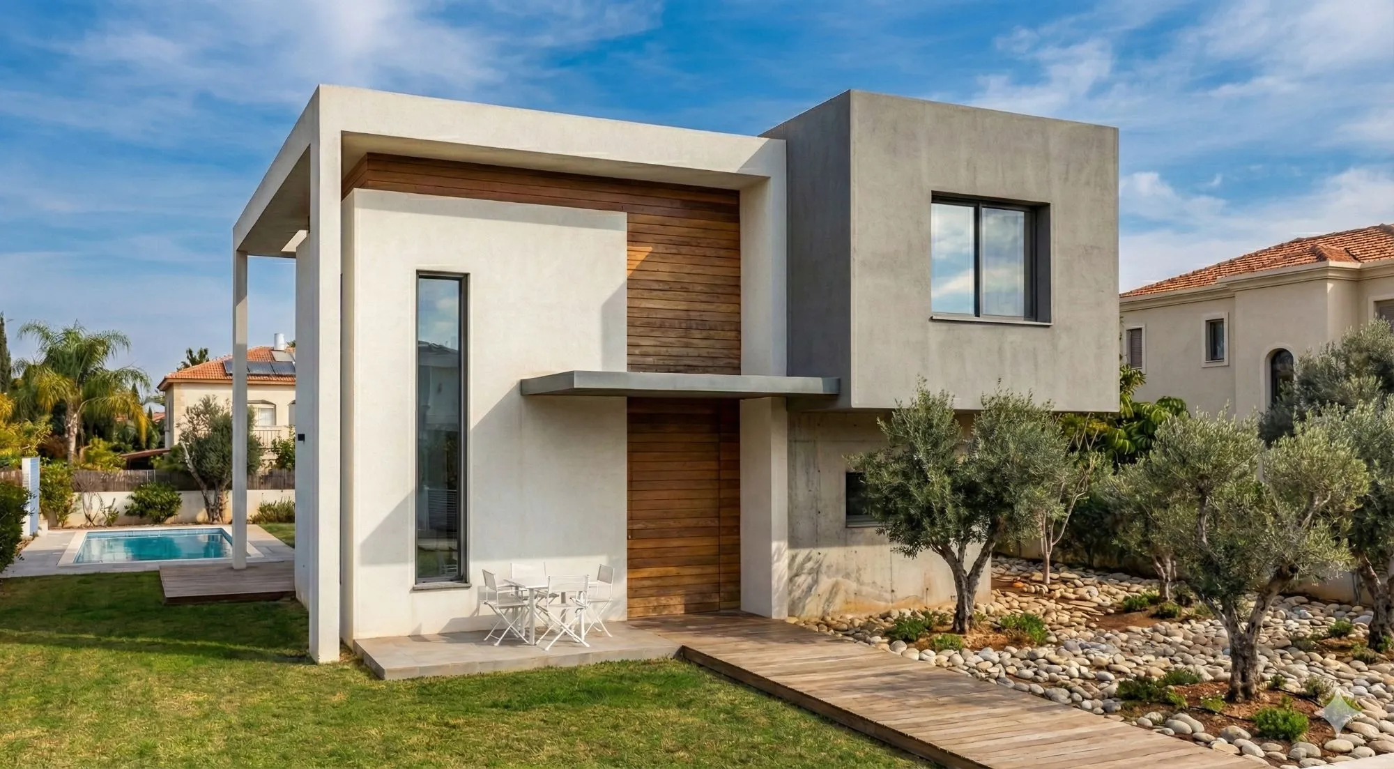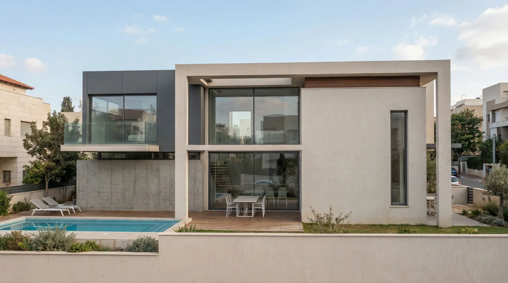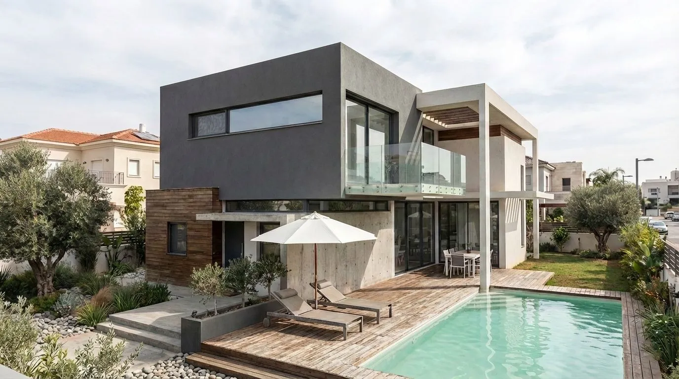 בית שתוכנן עבור זוג עם ילדים צעירים בהרחבה של מושב באזור עפולה. הלקוחות ביקשו בית בעל שפה אדריכלית מודרנית, המשלבת פתיחות אל החצר והבריכה כחלק בלתי נפרד מחיי הבית. בחזיתות המבנה שולבו חומרים טבעיים כגון בטון ועץ, המדגישים את המסות האדריכליות ויוצרים קומפוזיציה נקייה ומאוזנת. השילוב בין החומרים מעניק לבית מראה מודרני לצד תחושת חמימות טבעית. הבריכה מוקמה בחלק האחורי של המגרש בהתאם לכיווני האוויר והאור, והבית נפתח אליה באמצעות פתחים רחבים המחברים בין חללי הפנים לחצר. כך נוצר רצף טבעי בין החוץ לפנים ומרחב מגורים הפתוח אל הגינה והנוף.