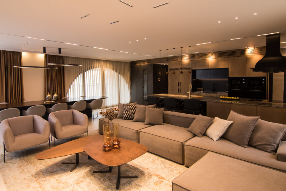 הדירה תוכננה עם חלל אירוח מרווח מאוד, מטבח עם משטח אבן טבעית שנבחרה בקפידה בהתאמה מושלמת עם צבע הנחושת של ארונות המטבח, ספרייה עם טלוויזיה נסתרת ופינת נטילת ידיים מעוצבת נגישה לאורחים.