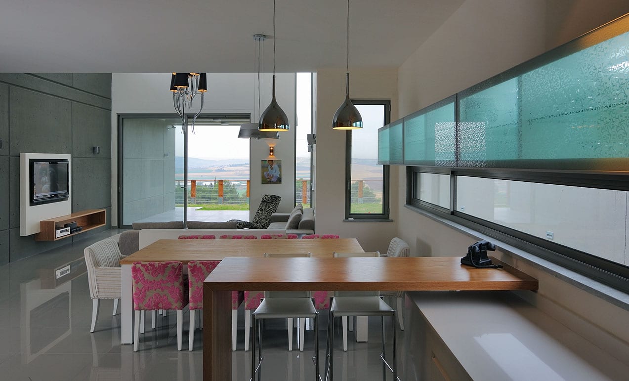 שילוב של חומרים טבעיים, בטון ועץ, נותנים לנו הצצה אל אופי הבית החצר. מרחבים של טבע ובית אחד על ההר חלונות עליונים